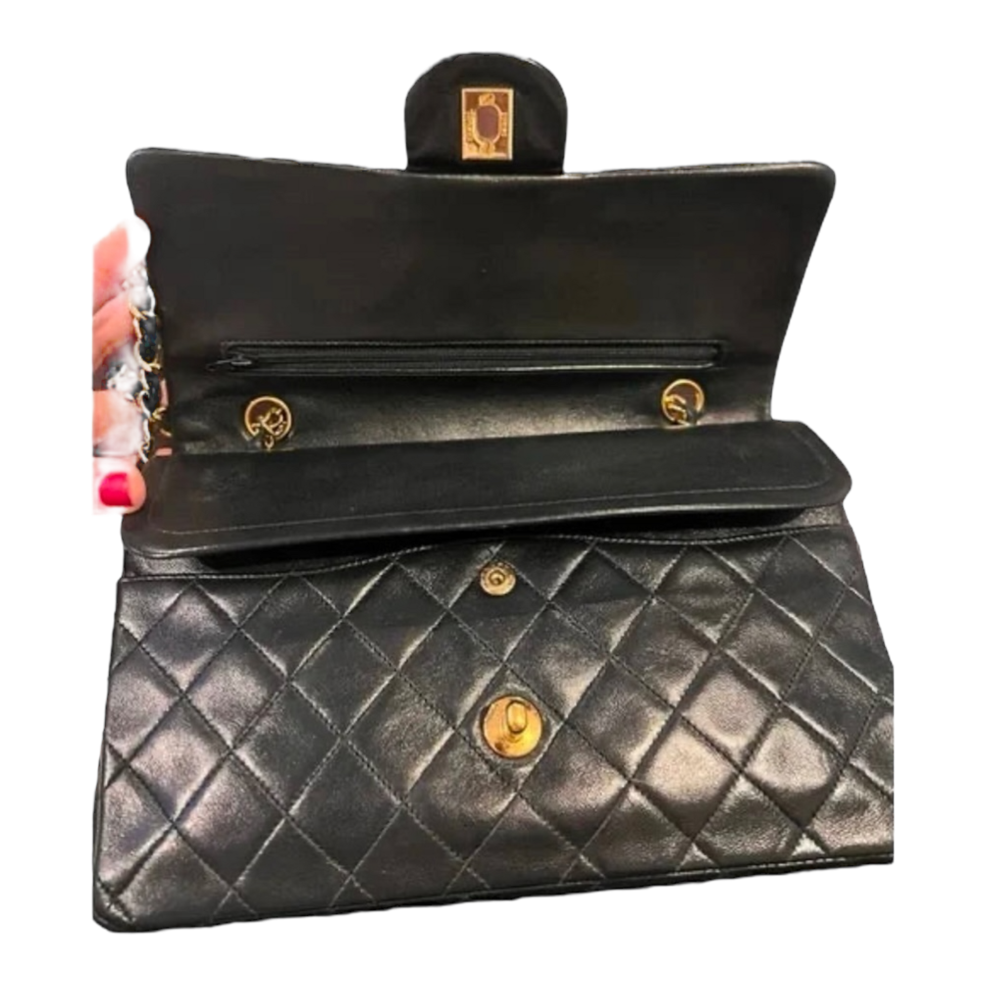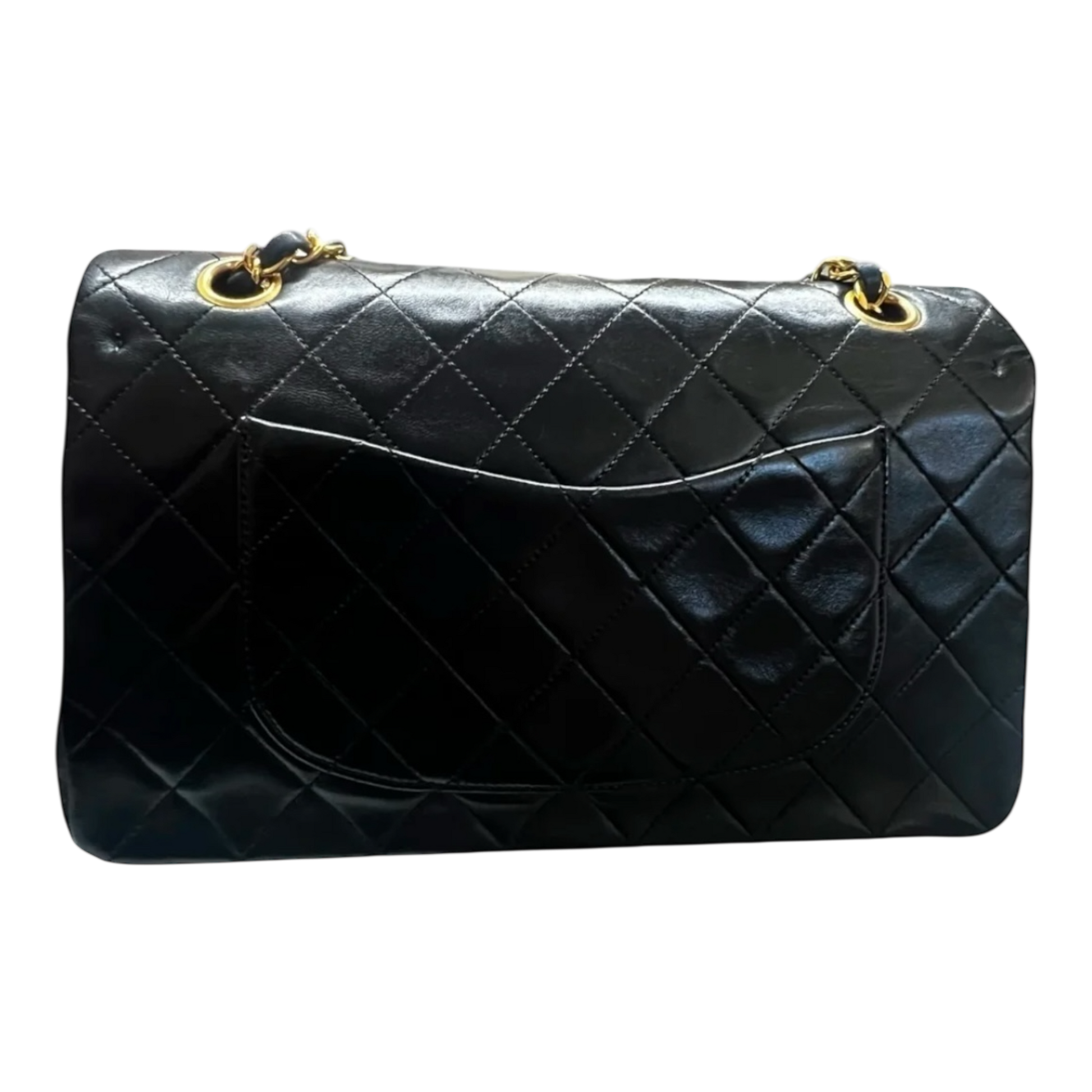 Timeless and iconic, the Chanel Vintage Classic Flap Bag in black lambskin leather is a piece of fashion history. Crafted from soft, luxurious lambskin, this bag features Chanel’s signature diamond quilting and the iconic CC turn-lock closure in elegant gold-tone hardware. The supple leather and vintage charm give it a truly unique, classic appeal. With its spacious interior and timeless design, this vintage Chanel flap bag is a coveted addition to any collection, exuding sophistication and timeless elegance.