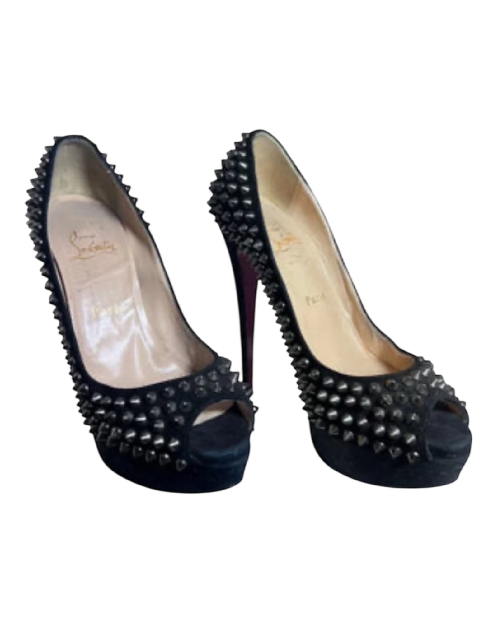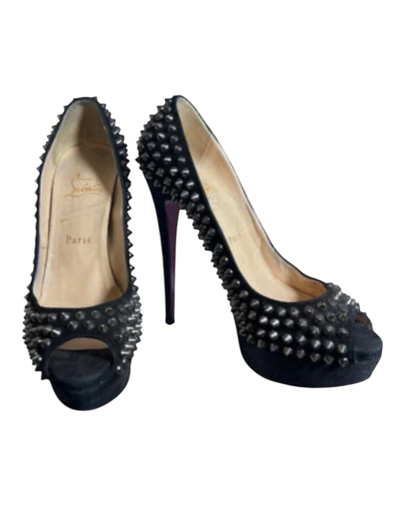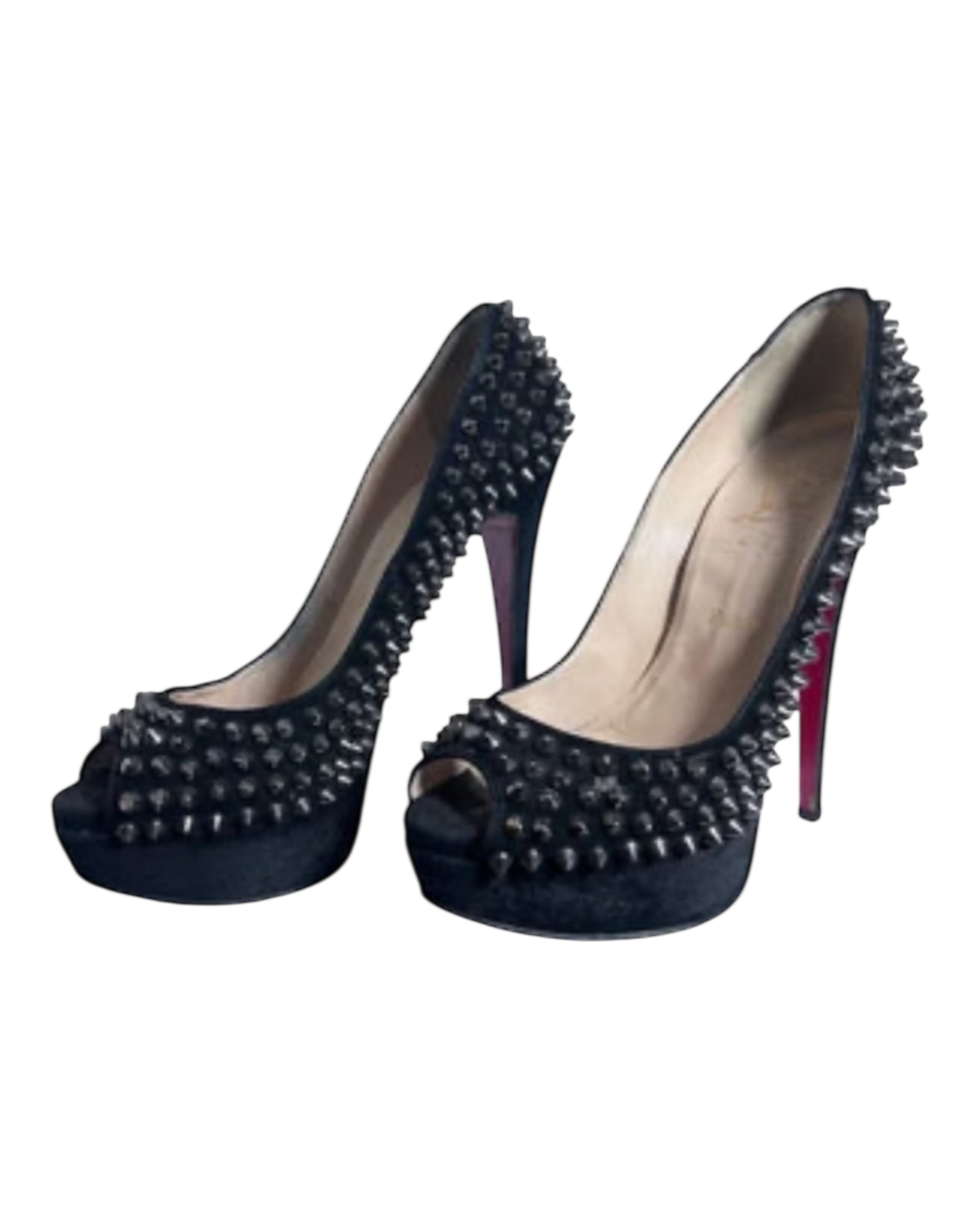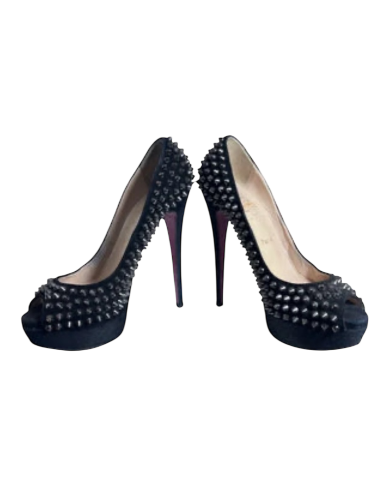 Introducing Christian Louboutin's iconic Lady Peep stud heels, featuring a pointed toe, sleek stiletto heel, and edgy stud detailing. These shoes elevate any outfit with their signature red sole and glamorous design. Made for the confident and fashionable woman seeking a touch of luxury in her wardrobe.