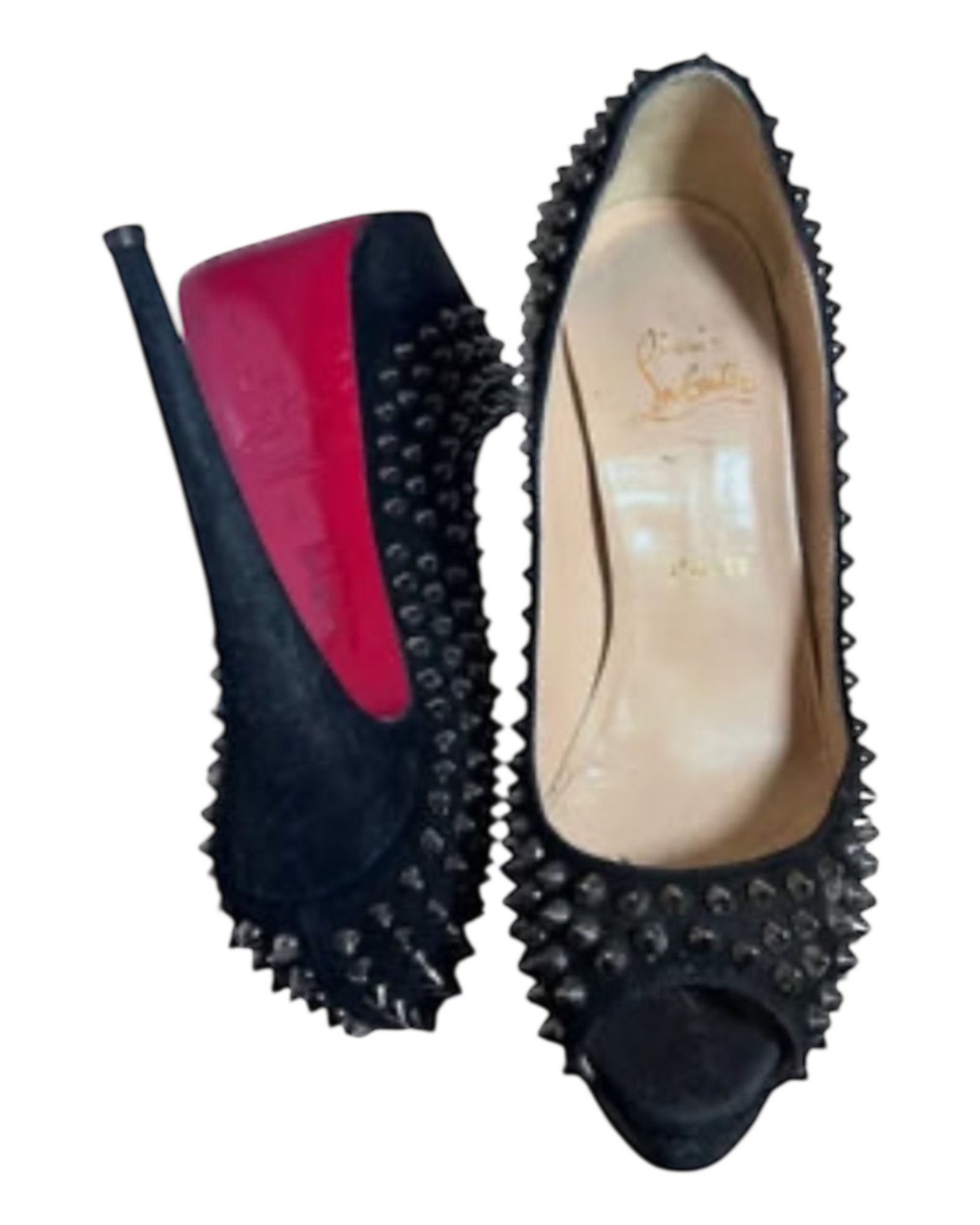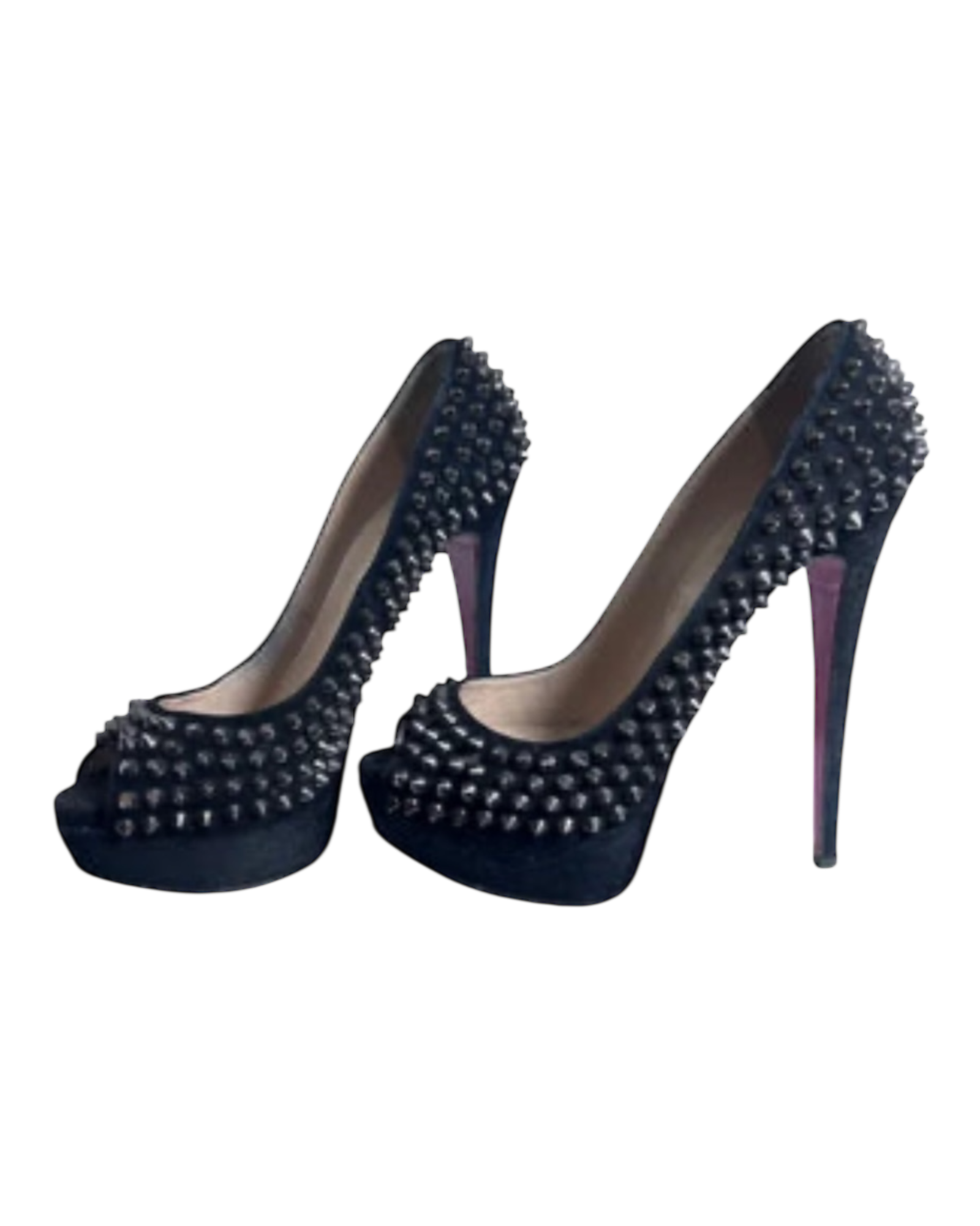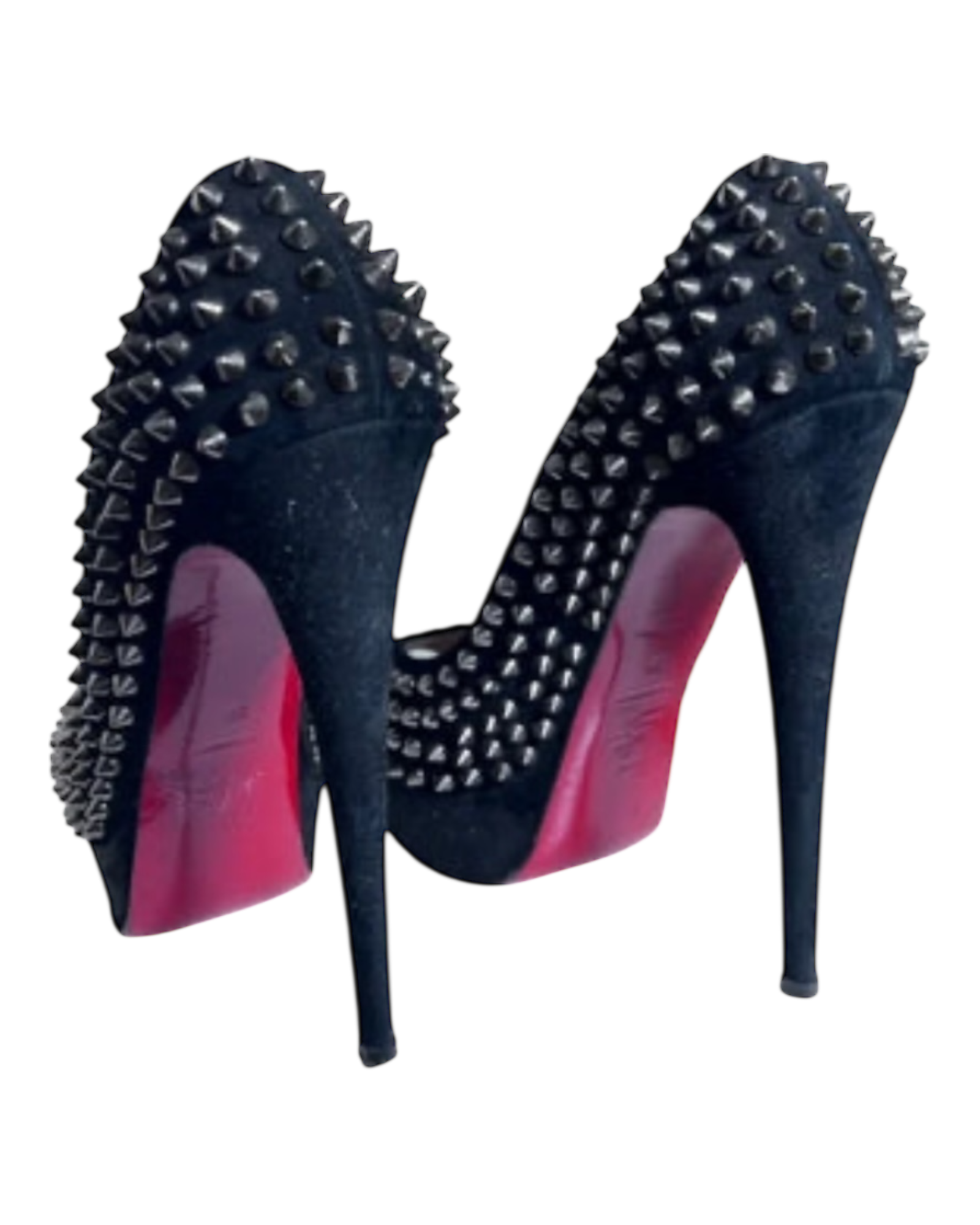 Introducing Christian Louboutin's iconic Lady Peep stud heels, featuring a pointed toe, sleek stiletto heel, and edgy stud detailing. These shoes elevate any outfit with their signature red sole and glamorous design. Made for the confident and fashionable woman seeking a touch of luxury in her wardrobe.