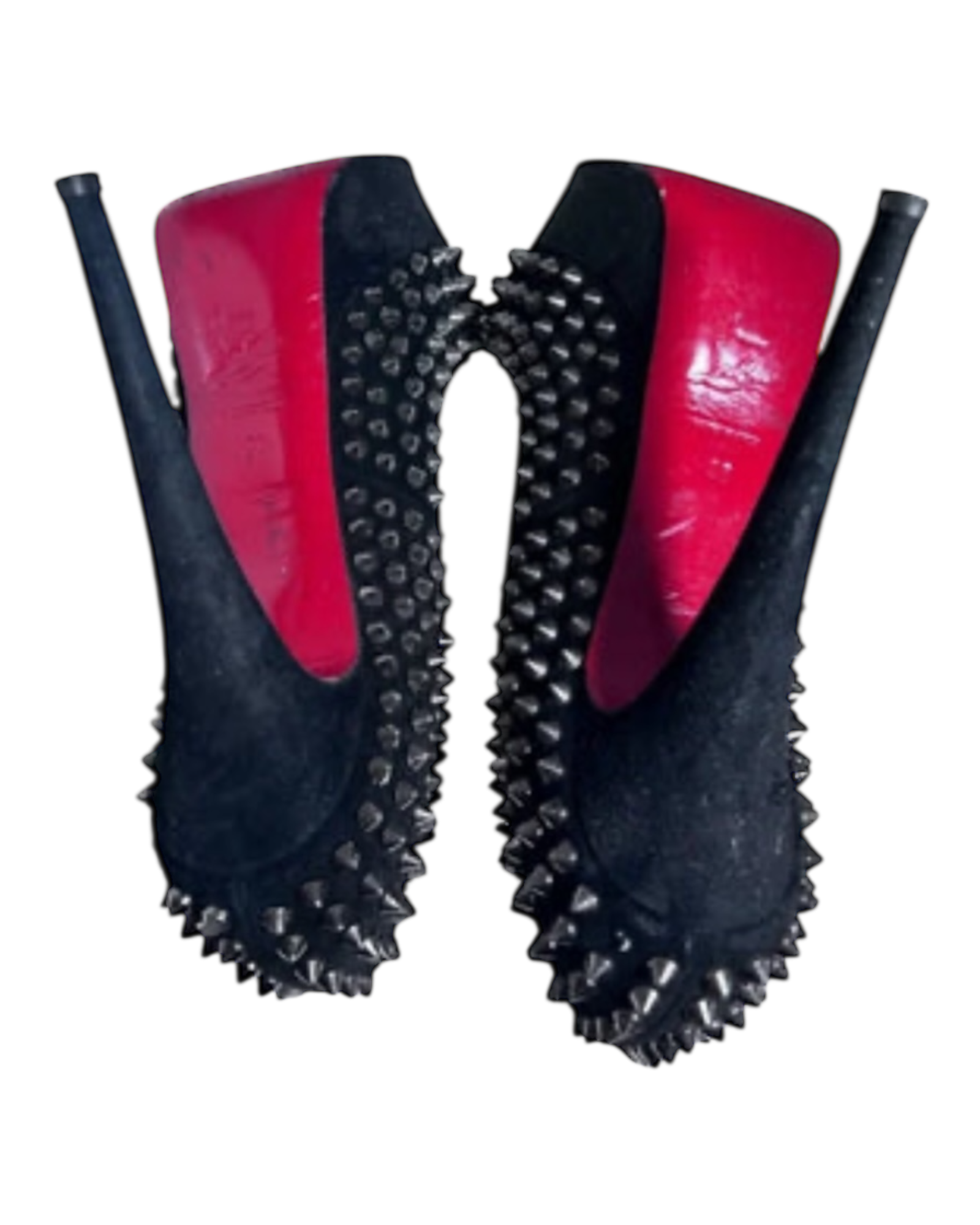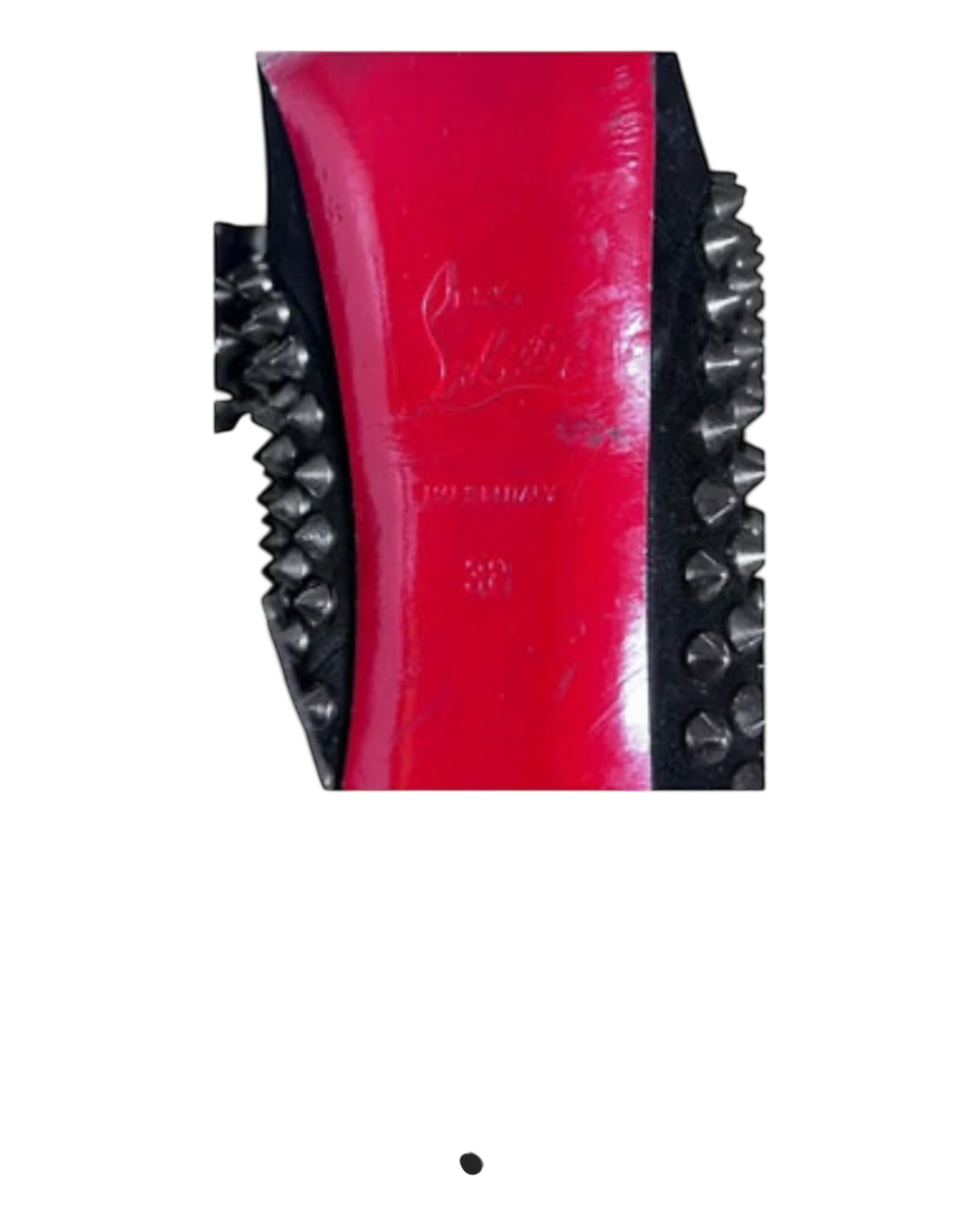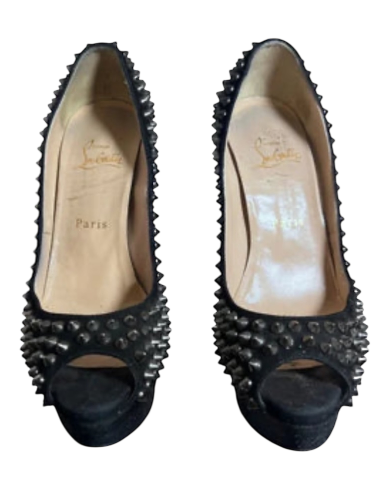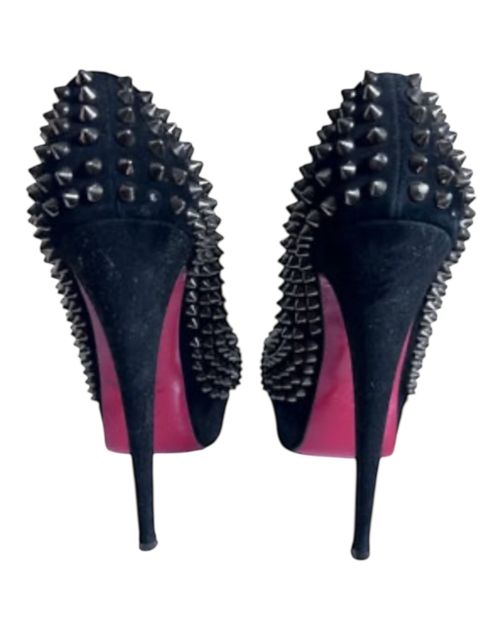 Introducing Christian Louboutin's iconic Lady Peep stud heels, featuring a pointed toe, sleek stiletto heel, and edgy stud detailing. These shoes elevate any outfit with their signature red sole and glamorous design. Made for the confident and fashionable woman seeking a touch of luxury in her wardrobe.