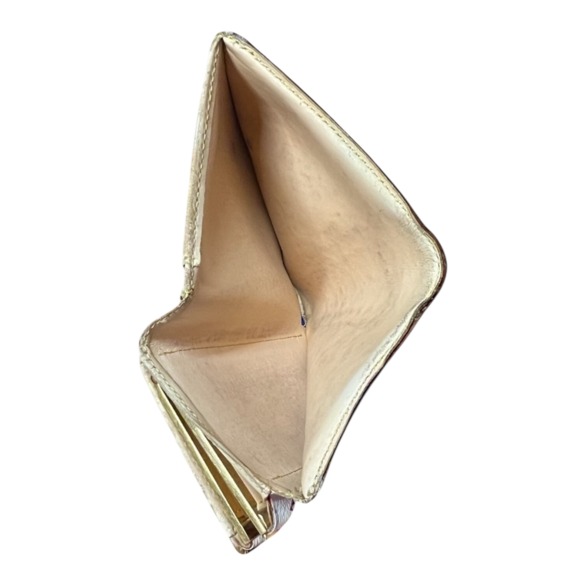 Exterior: The canvas has experienced some fading over time, with slight cracking visible in certain areas. The leather trim has darkened with age, adding a characteristic patina to the wallet.Interior: The interior shows noticeable signs of wear, including staining, peeling, and a few dirt marks, consistent with its vintage condition. General wear: The edges show some wear, but the overall structure remains intact. Despite the visible imperfections, the wallet remains functional and retains its charm.