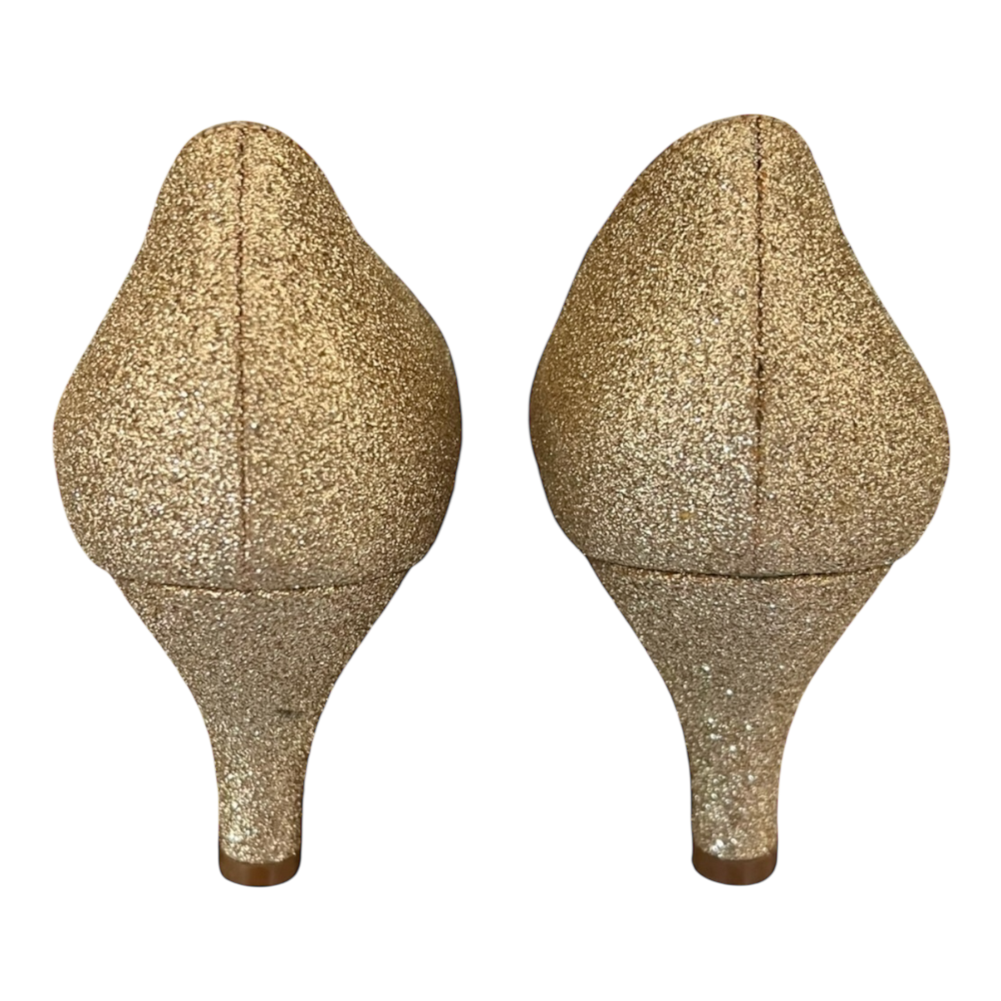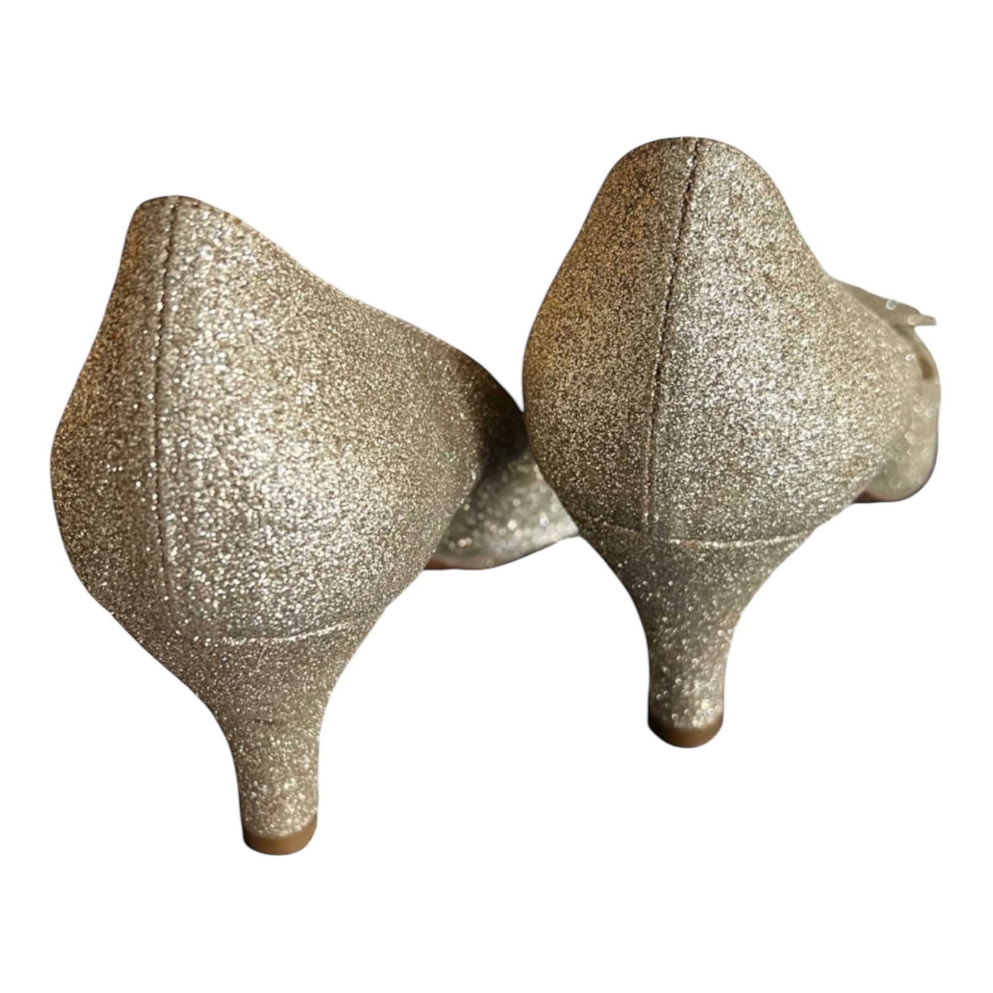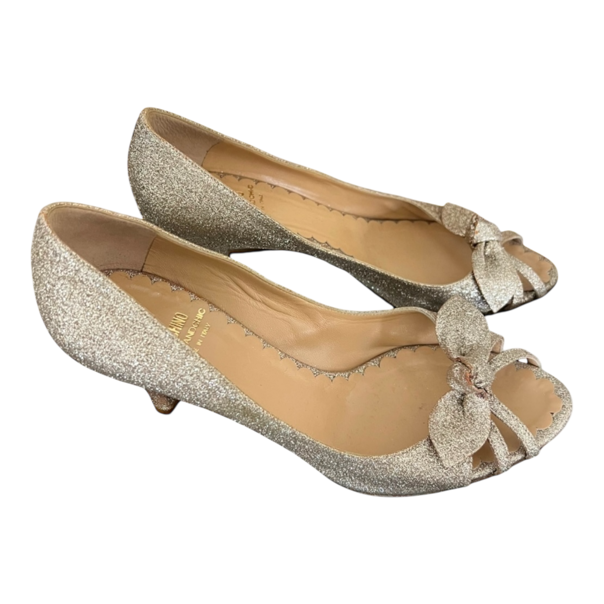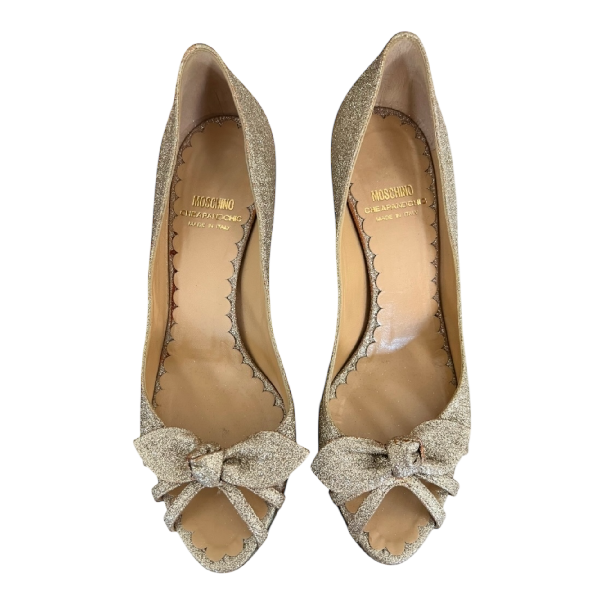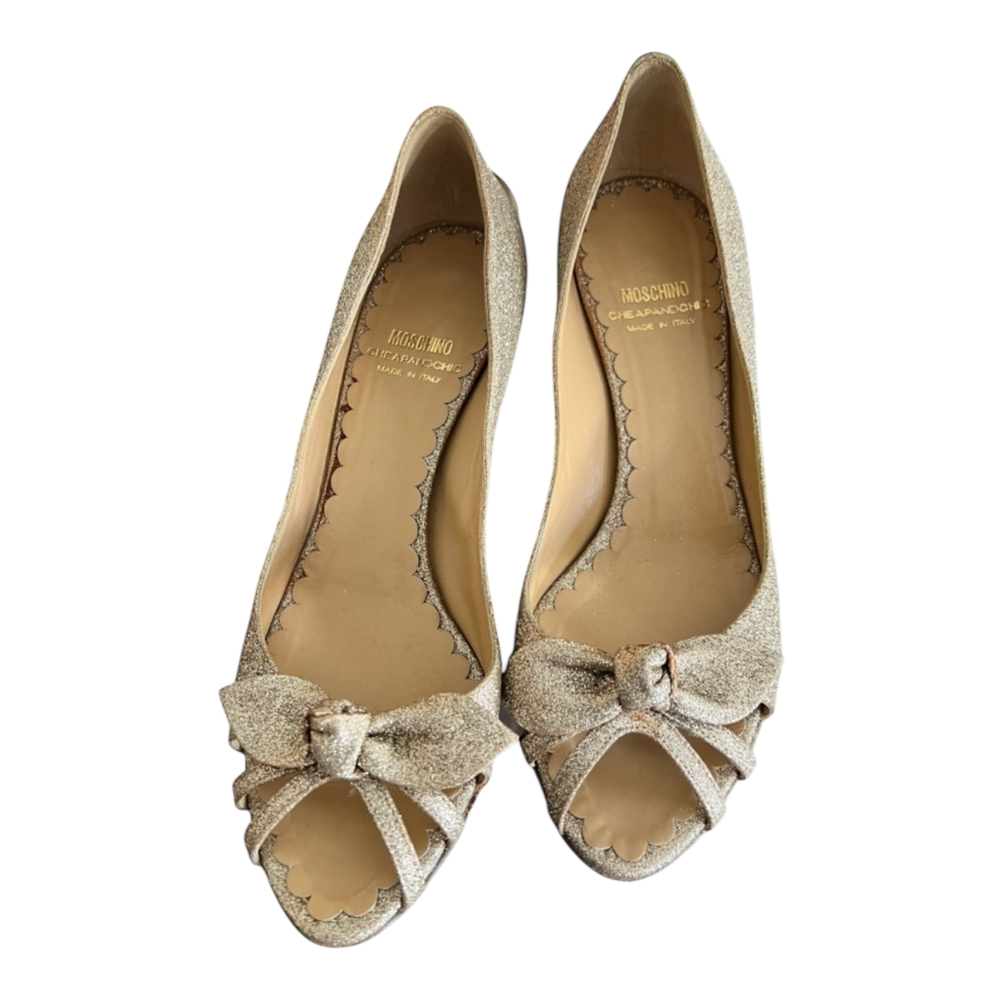 Elevate your footwear collection with these sophisticated Moschino open toe kitten heels. Crafted in a stunning metallic gold finish, these refined shoes feature a distinctive accent bow that adds a touch of feminine elegance. The modest kitten heel provides comfortable elevation while maintaining walkability, making them perfect for both special occasions and upscale everyday wear.