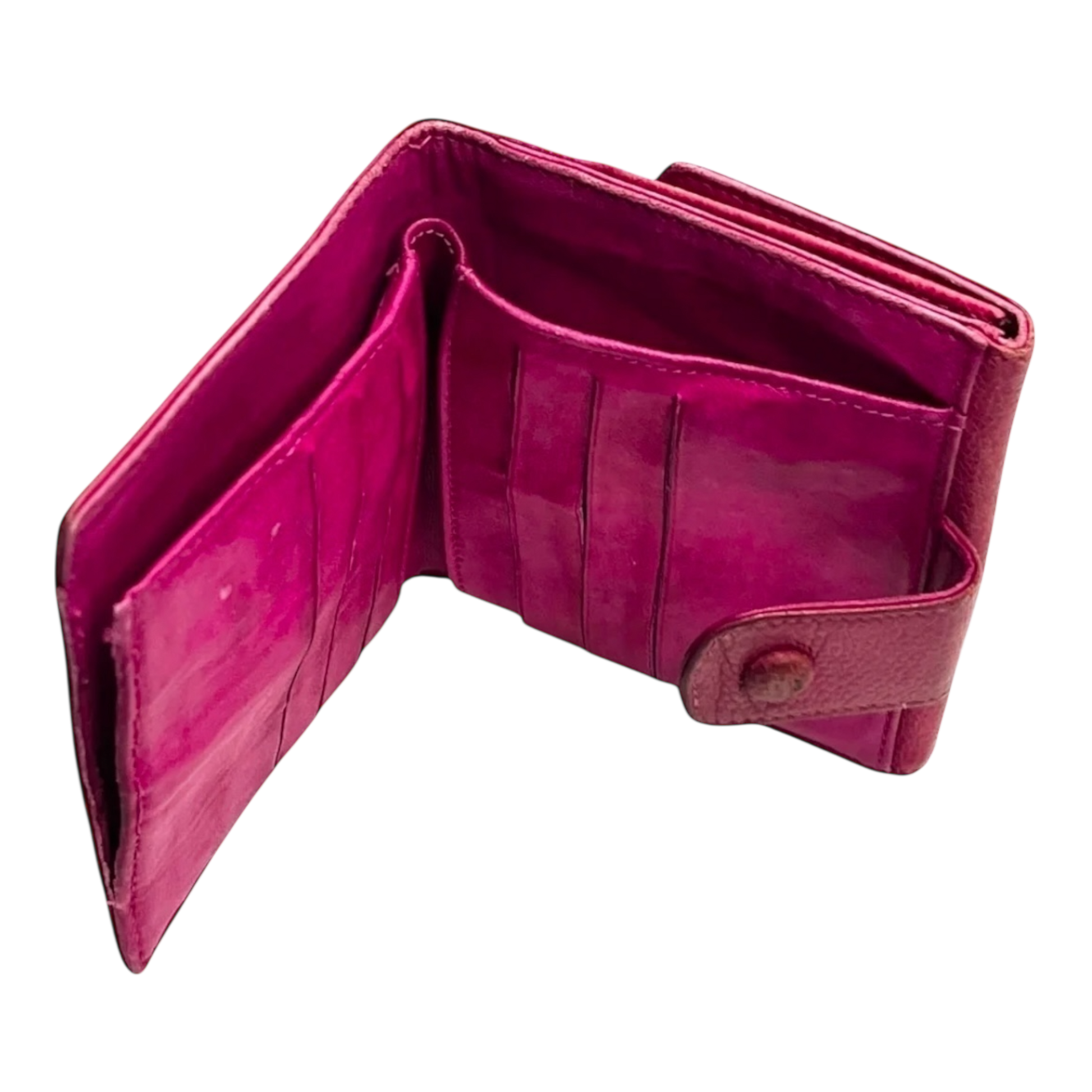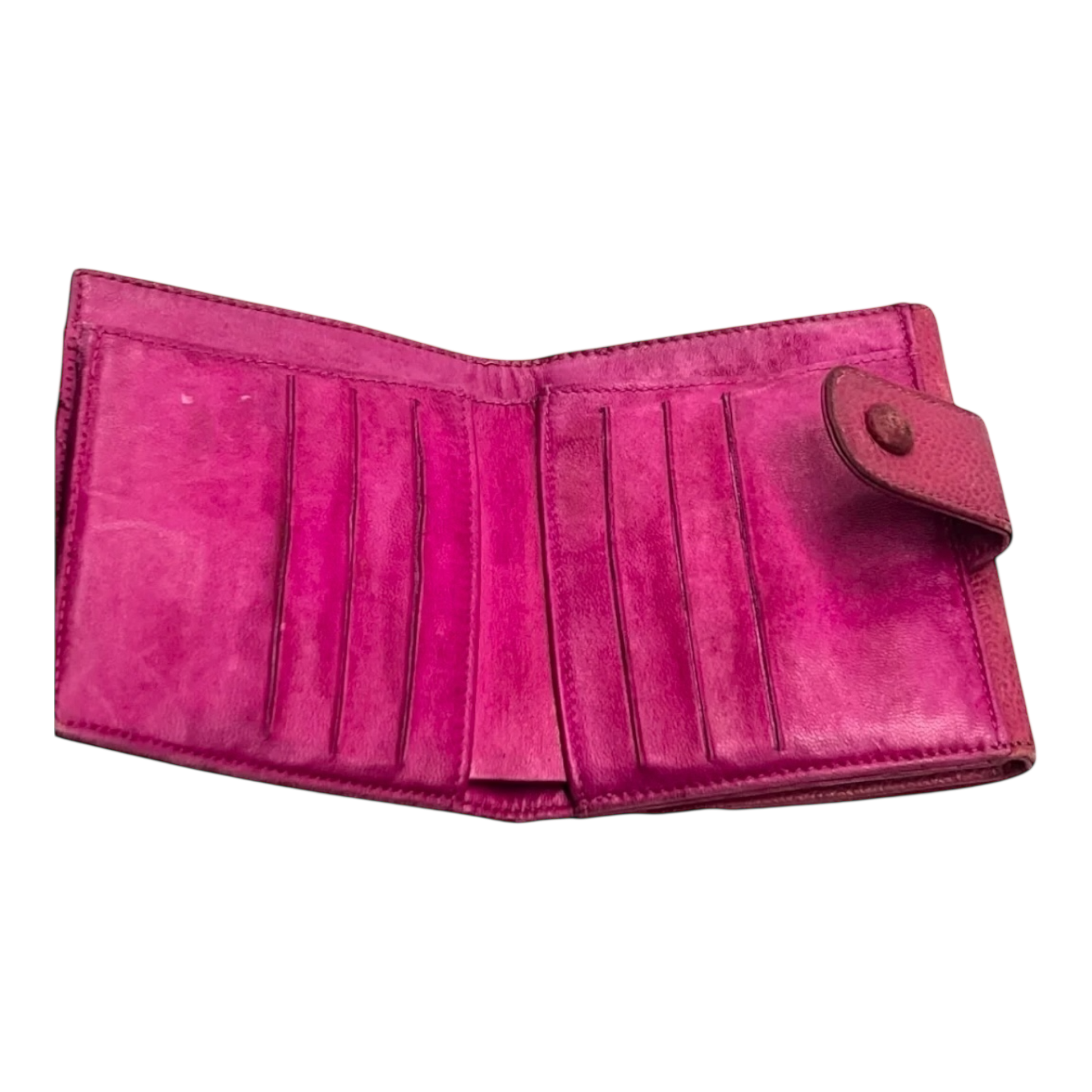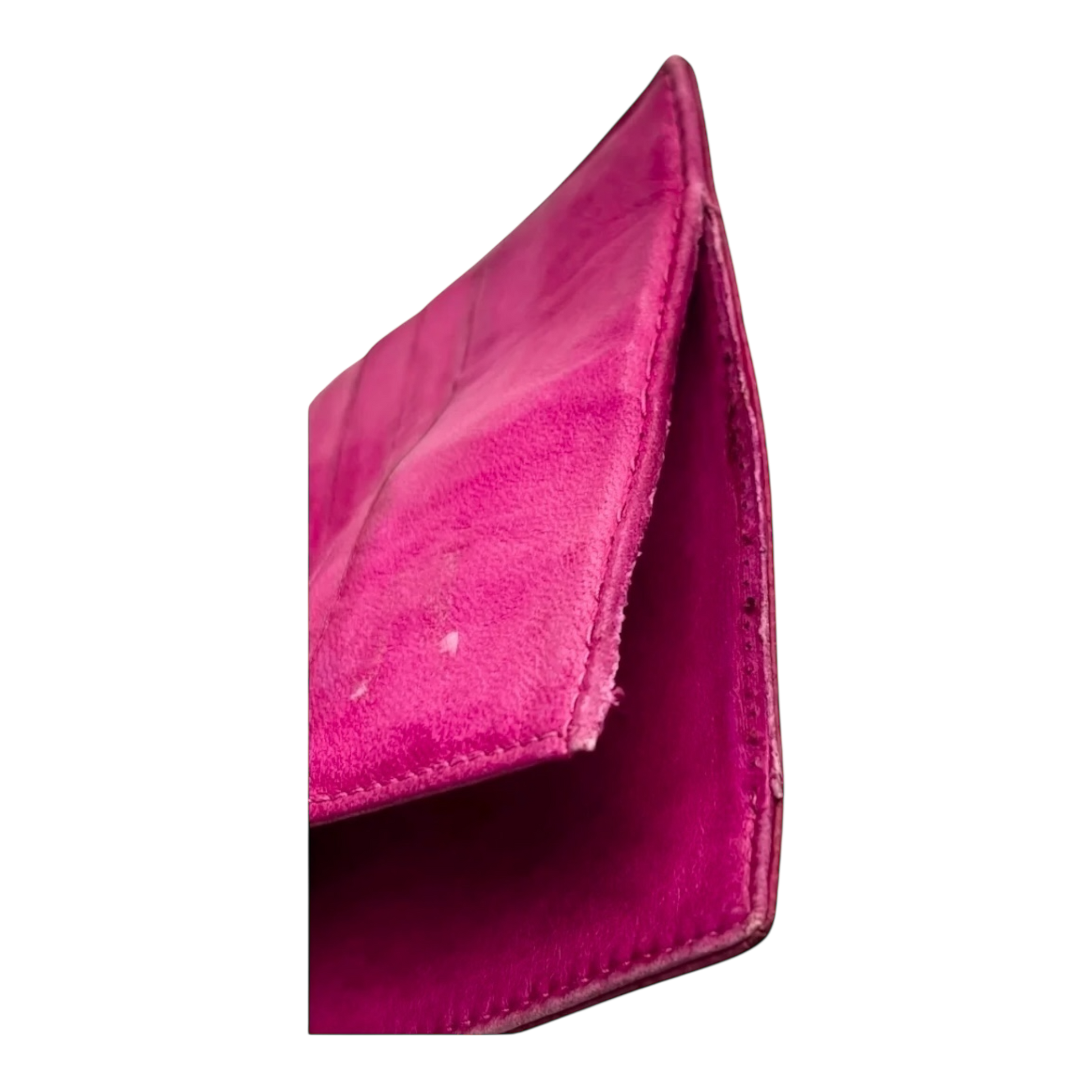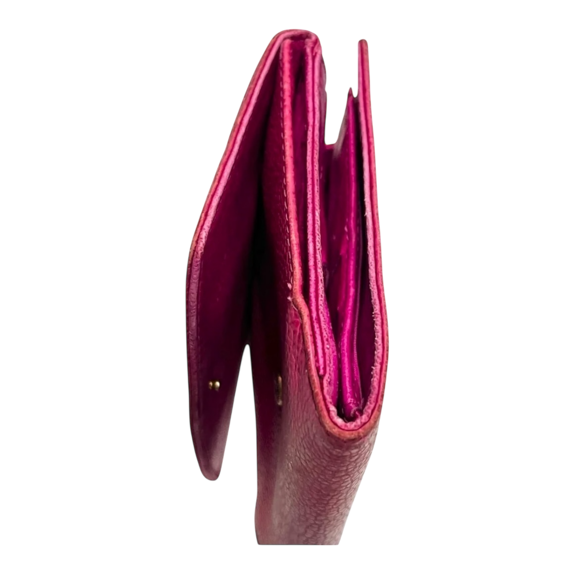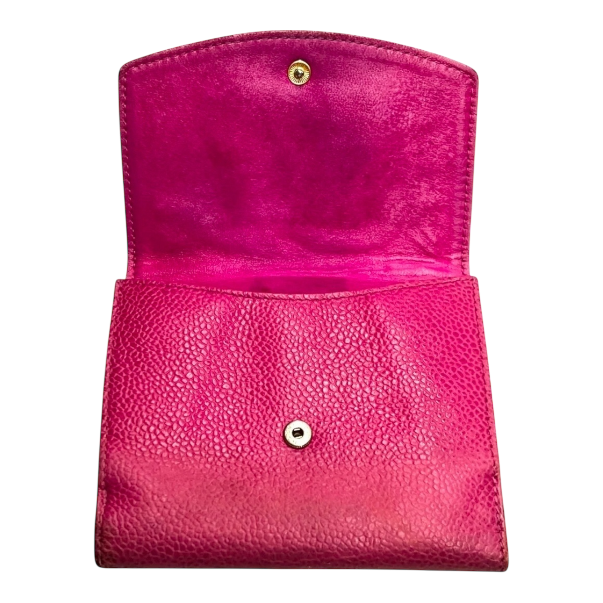 This stunning vintage Chanel compact wallet is crafted in soft pink caviar leather, a beautiful and timeless color. Known for its durability and luxury, this wallet is a classic piece that remains iconic despite the signs of wear.